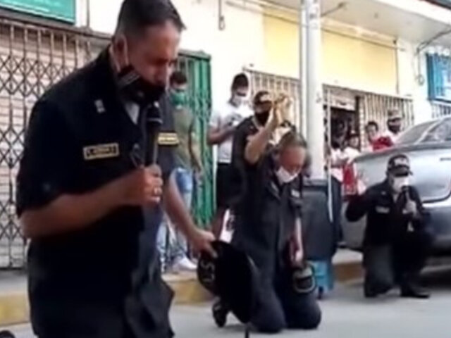 Un grupo de agentes policiales, junto a varios pobladores, pidieron a Dios que los pacientes de coronavirus superen la enfermedad.