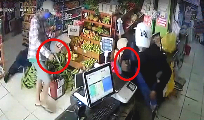 Las cámaras de seguridad de un minimarket en Puerto Maldonado captaron el momento en que dos delincuentes armados cometieron un violento asalto, donde incluso un policía fue reducido a golpes. Uno de los ladrones apuntaba con un arma y amenazaba a muerte a los clientes y trabajadores, mientras su cómplice revisaba todos los cajones del lugar buscando dinero.