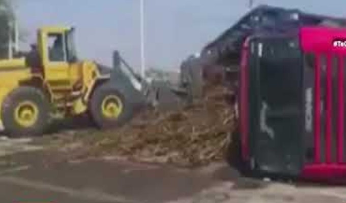 En Piura, un tráiler que transportaba toneladas de caña de azúcar, se volcó en la panamericana norte, ingresando a la provincia de Sullana.
