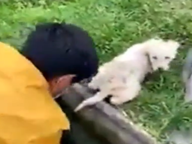 Uno de los hombres sujetó las piernas de su compañero para que ingresara al buzón de más de un metro y medio de profundidad y retirar al perrito que estaba a punto de morir ahogado.