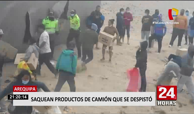 En Arequipa, un gran número de personas saquearon los productos de un tráiler, que se despistó luego que se le vaciarán los frenos en el kilómetro 524 de la Panamericana Sur.