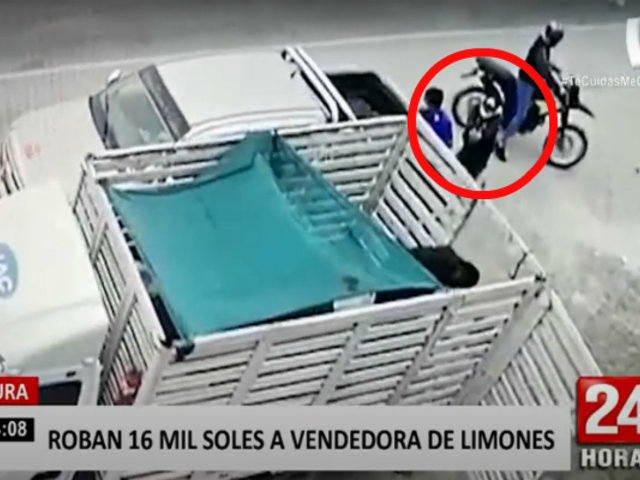 Cámaras de seguridad registraron el violento asalto a una comerciante de limones. El hecho ocurrió en el sector Cieneguillo Norte en Sullana, Piura, donde dos delincuentes encañonaron a la vendedora y le quitaron 16 mil soles cuando estaba a lado de un camión, junto a sus trabajadores, descargando limones.