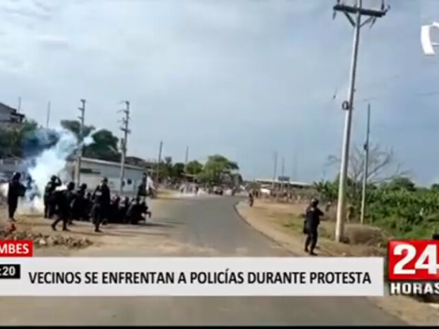 En Tumbes, con gases lacrimógenos, la Policía Nacional del Perú desalojó a un grupo de ciudadanos, quienes los atacaron lanzando piedras, luego que estos tomarán la carretera en protesta a obras inconclusas y contaminación a la que están expuestos en el distrito de Cerro Blanco.