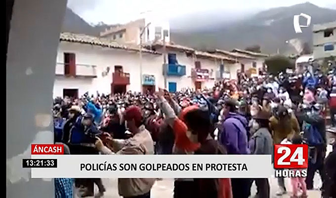 Decenas de pobladores del distrito de Conchucos en Áncash, se enfrentaron a la policía cuando intentaban tomar el municipio exigiendo la renuncia del alcalde Lorenzo Miranda Blas.