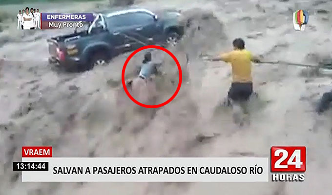 Peligrosos momentos de tensión vivieron los pasajeros de una camioneta, cuando el vehículo quedó atrapado en medio de un río en el Vraem, en la localidad de Chola Valdivia.