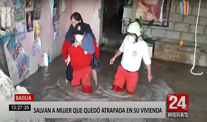 Los bomberos rescataron a una mujer que quedó atrapada al interior de su vivienda, cuando una de las paredes de su casa se vino abajo producto de las fuertes lluvias que se registra en Bagua.