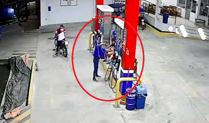 En Iquitos, la cámara de vigilancia de un grifo ubicado en el distrito de Belén, captó el preciso momento en el que dos delincuentes arrebataron el canguro a uno de los trabajadores.