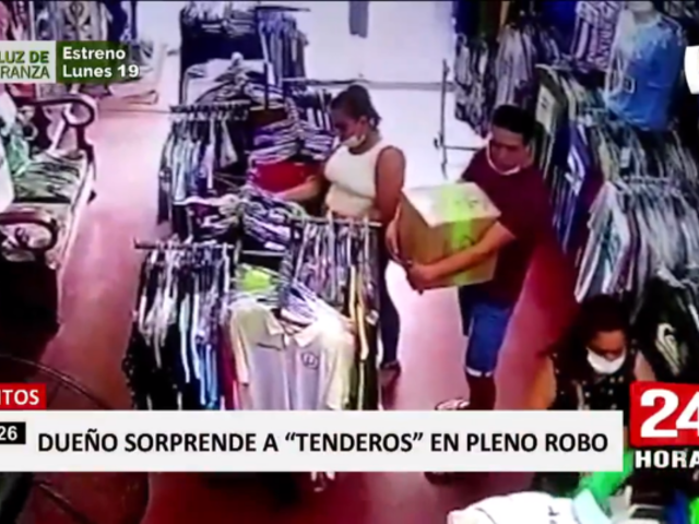 Cámaras de seguridad captaron el momento en que delincuentes sustraían mercadería de tienda y fueron descubiertos.