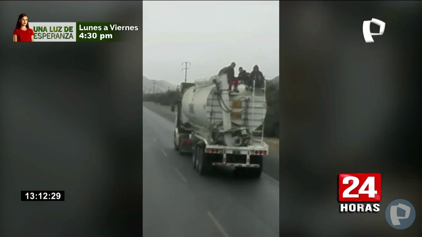 En la carretera hacia Virú, un testigo grabó nada menos a que a un grupo de personas que viajaban sobre una cisterna de GLP.