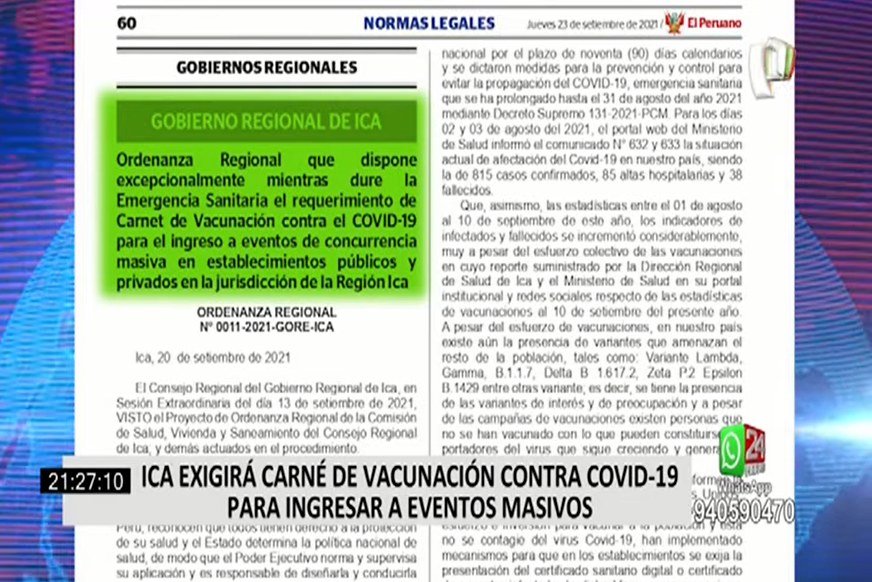 Este jueves el gobierno regional de Ica promulgó la ordenanza para exigir un carnet de vacunación contra la COVID-19, con las dos dosis requeridas, para el ingreso a "eventos de concurrencia masiva en establecimientos públicos y privados en la región".