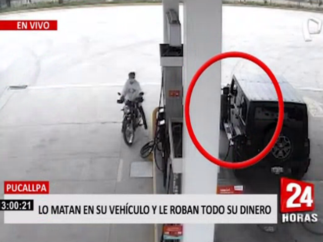 Las cámaras de vigilancia de un grifo en Pucallpahan registrado el preciso momento que dos delincuentes en una moto lineal asesinaron de un balazo a un empresario que estaba dentro de su vehículo y se llevaron casi S/ 40 mil que había retirado de una entidad bancaria.