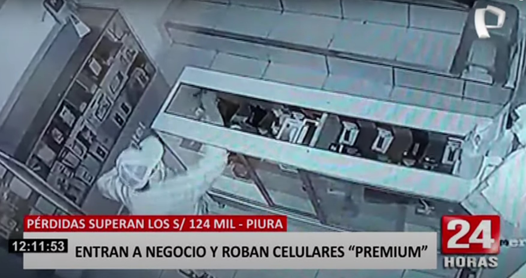 Un delincuente fue captado en pleno robo, ingresando a una tienda dedicada a la venta de celulares, ubicada en el distrito de Tambo grande en Piura.
