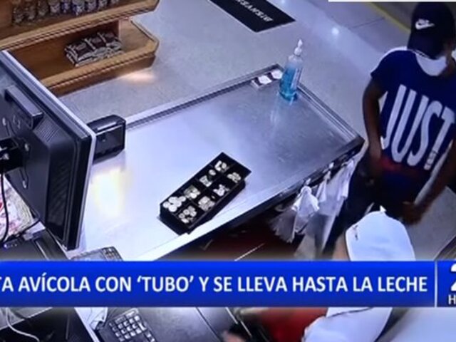 Las cámaras de seguridad del recinto registraron el preciso instante en el que el sujeto llega a la avícola a bordo de una motocicleta, ingresó al local y amedrentó a la trabajadora encargada con un tubo de metal, haciéndolo pasar como si fuera un arma de fuego.