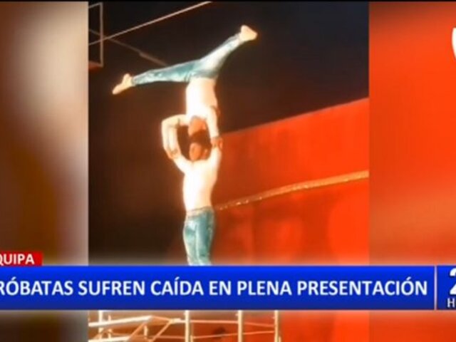 Dos jóvenes acróbatas sufrieron una aparatosa caída cuando realizaban una arriesgada maniobra durante una presentación en vivo, como parte de un show circense en la ciudad de Arequipa. Los talentosos jóvenes terminaron accidentándose cuando pasaban por una pequeña escalera.