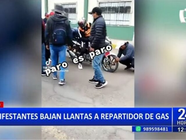 En el marco del octavo día de las manifestaciones en el interior del país en rechazo al gobierno de Dina Boluarte, un grupo de vándalos en la ciudad de Juliaca, Puno, pincharon las llantas de la motocicleta de un repartidor de gas por negarse a participar en las movilizaciones.