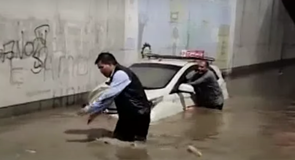 Una torrencial lluvia inundó las principales calles de las localidades de Alto Selva Negra, Miraflores y el Cercado de Arequipa. En este lugar un taxi quedó atrapado dentro del bypass de la avenida Mariscal Cáceres debido al agua empozada.