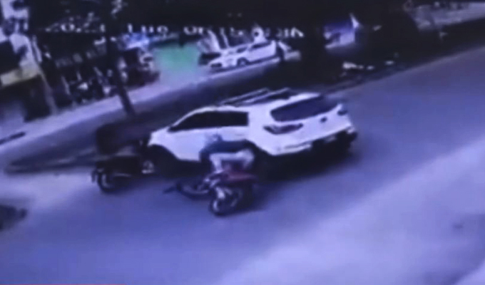 Las imágenes muestran cómo la camioneta da una vuelta cerrada sin tener en cuenta que dos motociclistas circulaban por dicha vía, por lo que terminó cerrando el paso de los conductores que impactaron violentamente con el vehículo mayor. El copiloto de una de las motos se elevó por los aires cayendo fuertemente al piso.