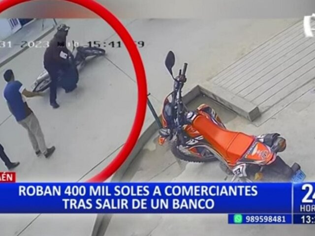 Millonario robo. Cámaras de seguridad captaron como dos delincuentes asaltaron a dos agricultores que habrían retirado un cuantioso monto de dinero de una agencia bancaria, en Jaén.