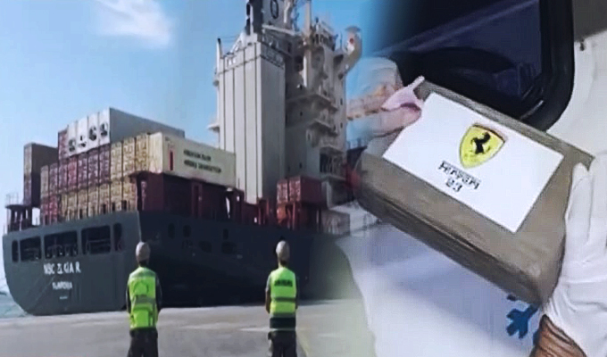 Al realizar la inspección en este buque de carga que llevaba una bandera liberiana y tenía como destino final Bélgica, los agentes encontraron 114 paquetes tipo ladrillo de cocaína que estaban enumerados y tenían el logo de la escudería Ferrari.