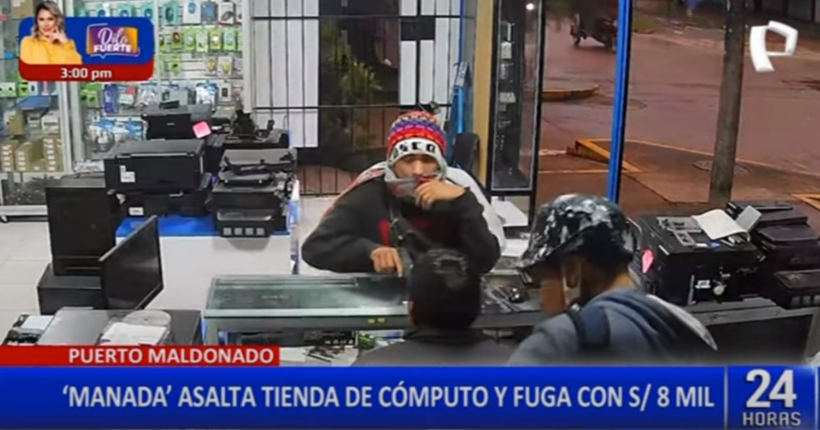 Dos delincuentes si hicieron pasar como clientes para asaltar una tienda de computadores en la ciudad de Puerto Maldonado, llevándose varios equipos valorizados en más de 8 mil soles. El hecho quedó registrado por las cámaras de seguridad del establecimiento.