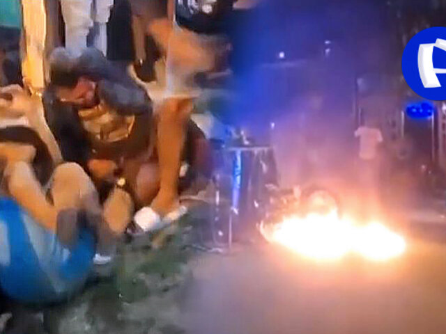 Los delincuentes se protegían como podían de los correazos, las patadas y puñetes que recibían de la multitud que los observaba atentamente. Luego de golpearlos duramente, los moradores prendieron fuego a la moto donde se movilizaban.