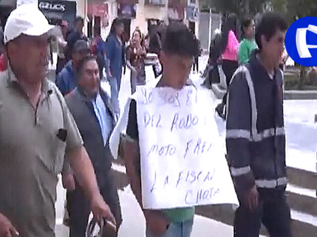 Chota: ronderos castigan a ladrón de moto obligándolo a caminar en plaza llevando un cartel