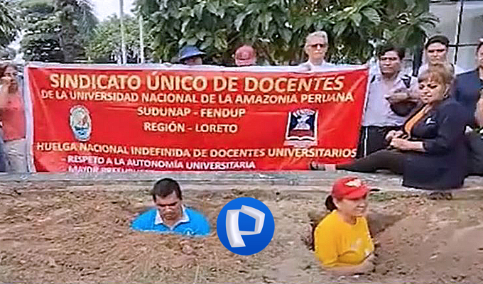 Dos docentes de la Universidad Nacional de la Amazonía Peruana en Iquitos, tomaron una radical medida al ver que sus reclamos no eran escuchados. Los profesores señalaron que se enterraron hasta el cuello para llamar la atención de las autoridades.