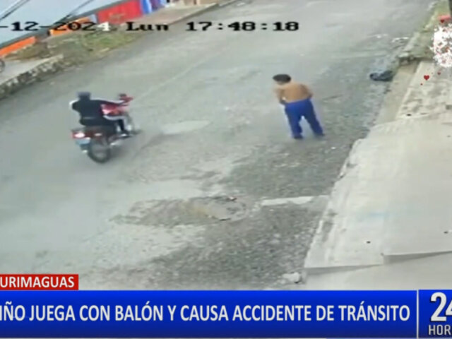 Las cámaras de seguridad de las calles de Yurimaguas captaron el momento exacto en el que un niño se encuentra jugando con un balón de fútbol y termina provocando un accidente.