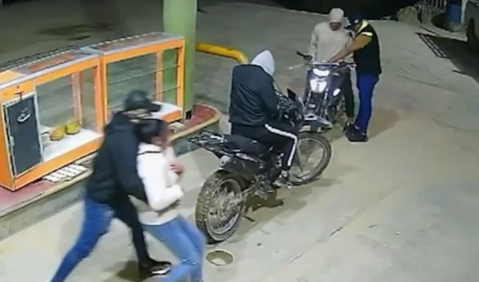 Mientras tanto su cómplice le quitaba las llaves de la motocicleta, a un hombre que esperaba abastecerse de combustible en el lugar.