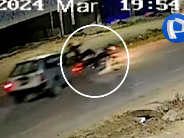 El conductor de la motocicleta, al parecer, no había divisó a tiempo el auto blanco cuando cruzó la vía con la motocicleta. En ese instante se escucha al vehículo tocar la bocina y poco después estamparse contra el vehículo menor, ocasionando que ambas personas salgan disparadas.