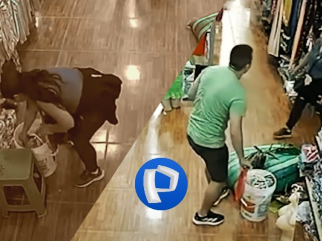 Las imágenes muestran cómo dos tenderos se hacen pasar por clientes y empiezan a guardar varias prendas en un balde.