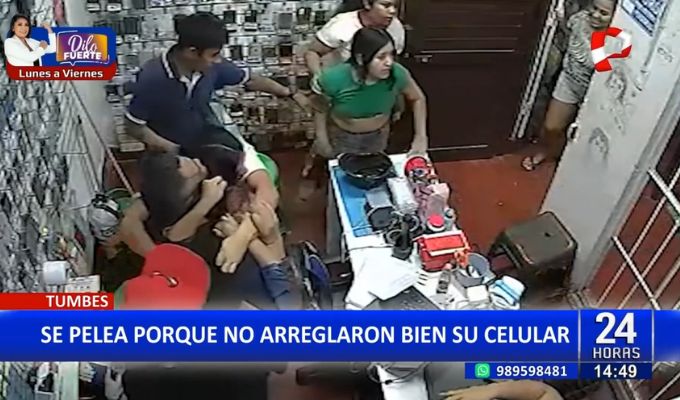 En la ciudad de Tumbes, dos mujeres protagonizaron un fuerte altercado, agarrándose de los pelos, debido a un presunto mal servicio realizado en una tienda dedicada a la venta y reparación de teléfonos celulares.