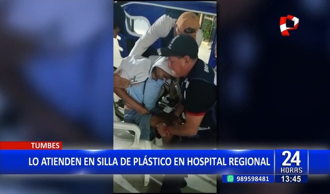 Un ciudadano fue trasladado en una silla de plástico hasta el área de emergencias del Hospital Regional de Tumbes "José Alfredo Mendoza Olavarría" debido a la falta de sillas de ruedas.