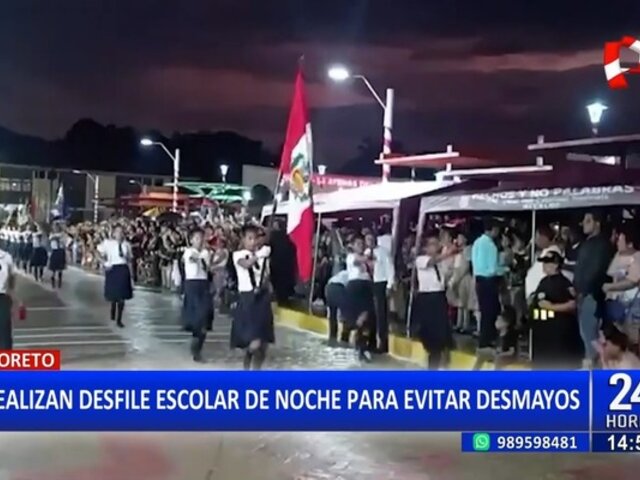 Las autoridades de la ciudad de Requena, en la región Loreto, decidieron organizar el desfile escolar en horario nocturno como medida de protección ante las altas temperaturas que soporta la ciudad, evitando así posibles desmayos entre los estudiantes.