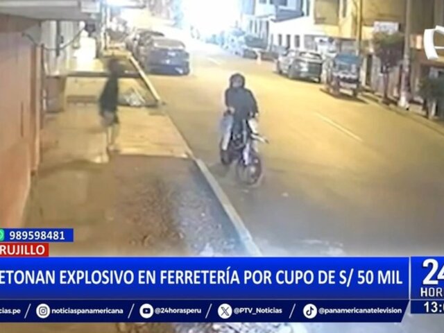 Dos delincuentes fueron captados por cámaras de seguridad mientras dejaban un explosivo en la puerta de una ferretería, exigiendo el pago de 50 mil soles en Trujillo.