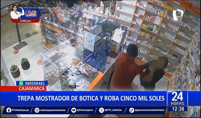 Un delincuente trepó por el mostrador de una botica para robar 5 mil soles en Cajamarca, el hecho fue captado por las cámaras de seguridad del establecimiento.