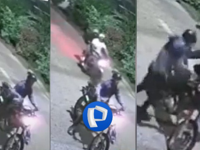 El video muestra cómo el motociclista se detiene en el semáforo cuando una moto con dos sujetos a bordo se aproxima. Uno de los delincuentes desciende rápidamente, apunta al dueño del vehículo con una pistola y realiza un disparo al aire para intimidarlo. Ante la amenaza, la víctima baja de su moto y huye corriendo para protegerse.