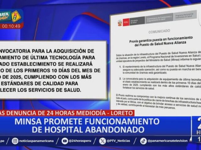 El Ministerio de Salud (Minsa), se pronunció luego que el último viernes, el noticiero 24 Horas Mediodía, informó que el hospital de la comunidad nativa de Nuevo Alianza, en Loreto, se encuentra inoperativo por falta de equipamiento.