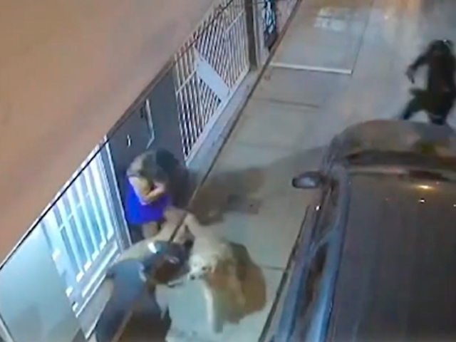Cámara de seguridad registró el momento cuando dos asaltantes armados desistieron de robarle a una joven porque sus mascotas no dudaron en resguardarla.