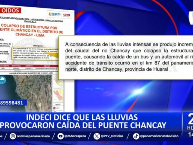 El Instituto Nacional de Defensa Civil (Indeci), se pronunció tras el colapso del puente Chancay ocurrido en horas de la madrugada de este viernes, que dejó como saldo dos personas fallecidas y al menos 38 heridos.