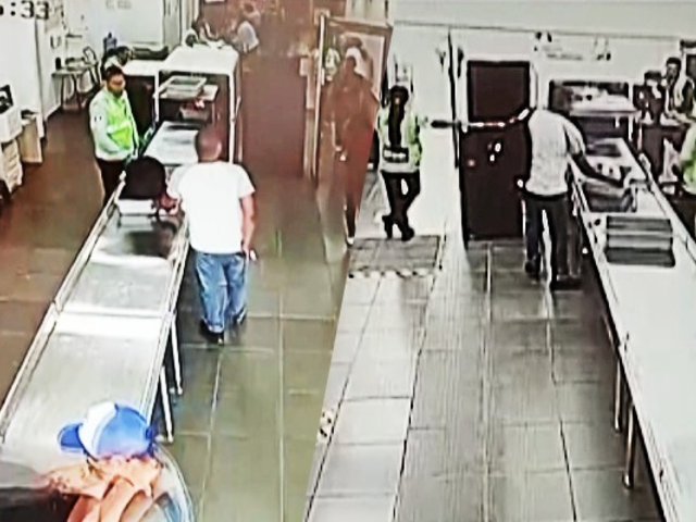 Las cámaras de seguridad grabaron el momento en que le hombre se despojaba de sus objetos personales: una laptop, un iPad y un reloj marca Apple para colocarlos en la bandeja que debía ser inspeccionada por rayos X, mientras que el hombre también pasó por el arco de seguridad, sin embargo, en lugar de recuperar todas sus pertenencias solo se llevó su mochila.