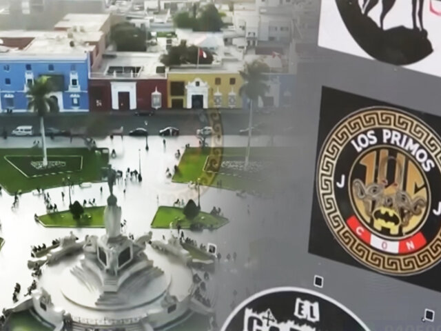 Una docena de pegatinas aparecen en plena Plaza de Armas en Trujillo. El uso de estos stickers por parte de extorsionadores es un método común de bandas criminales en esta parte del país para marcar negocios y viviendas que están bajo su control o son blancos de cobro de cupos.