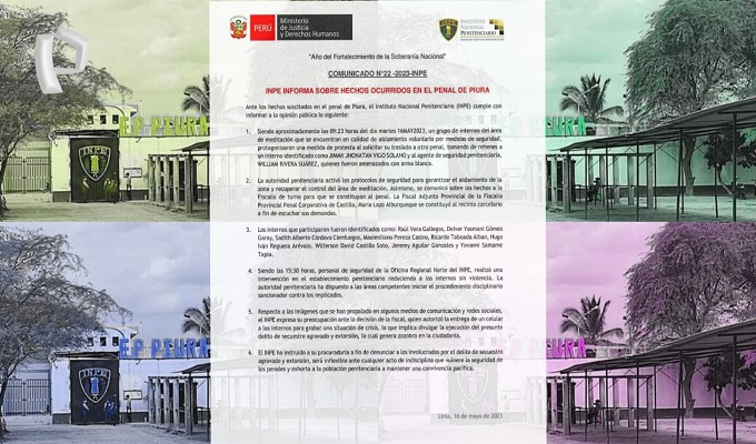 El INPE también detalló en su comunicado que un grupo de reclusos del área de meditación, tomaron como rehenes al reo Jimmy Jhonatan Vigo Solano y al agente de seguridad, William Rivera Suárez, a quienes amenazaron con una arma blanca.