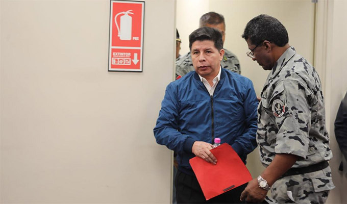 12: 20 p.m. Dice que no era una entrevista sino un mensaje a la Nación, donde anunció el golpe de Estado, tras su discurso Castillo se abraza con Aníbal Torres y luego con Bettsy Chávez.