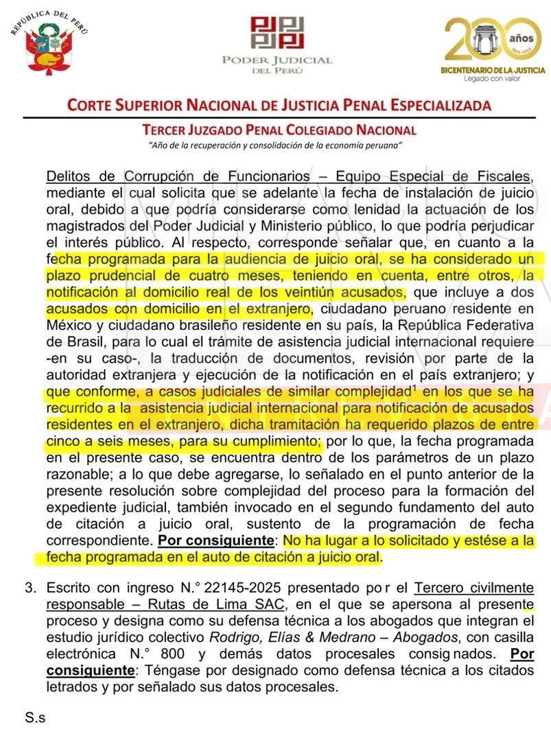 El Tercer Juzgado Penal Colegiado Nacional justificó su decisión argumentando la complejidad del proceso y las dificultades logísticas asociadas a las notificaciones internacionales. Dado que algunos acusados residen en el extranjero, como en México y Brasil, se requiere asistencia judicial internacional, lo que implica plazos adicionales. "Dicha tramitación ha requerido plazos de entre cinco a seis meses, para su cumplimiento; por lo que, la fecha programada en el presente caso, se encuentra dentro de los parámetros de un plazo razonable", se detalla en la resolución, destacando la necesidad de coordinar estas gestiones con autoridades extranjeras.