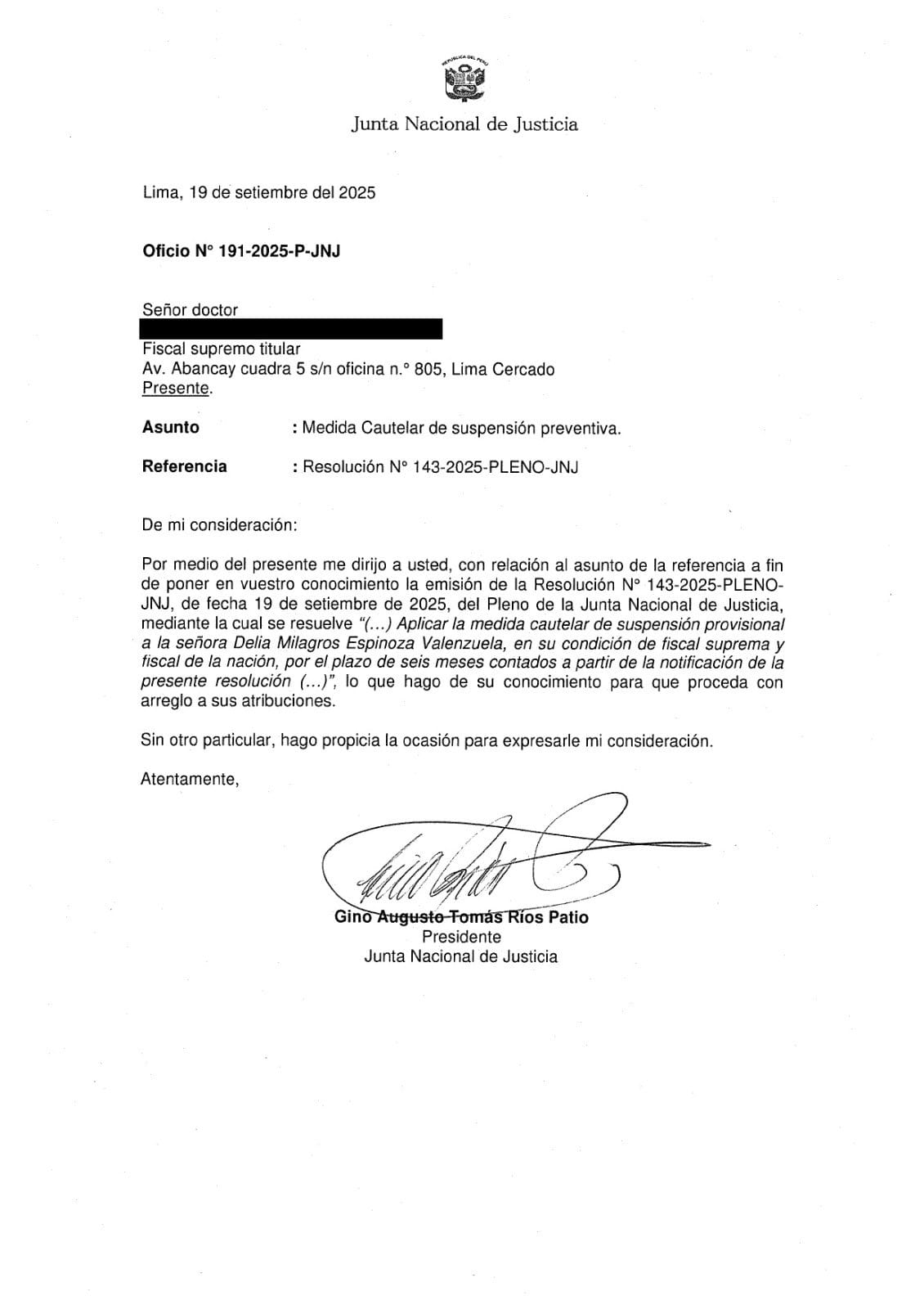 La Junta Nacional de Justicia (JNJ) aprobó la suspensión provisional por seis meses de la fiscal de la Nación, Delia Espinoza, tras un proceso disciplinario en el que se le atribuye la comisión de “faltas graves y muy graves” por no acatar la orden de reincorporar a Patricia Benavides en la Junta de Fiscales Supremos. La decisión se adoptó con tres votos a favor y dos en contra, en una sesión en la que no estuvo presente el magistrado Francisco Távara.
