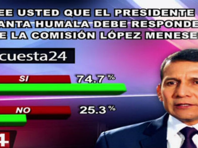 En Encuesta 24: a la pregunta “¿Cree usted que el presidente Ollanta Humala debe responder ante la Comisión López Meneses?rdquo;, un claro resultado coloca por encima con 74.7% a quienes piensan que el Jefe de Estado debe declarar ante los congresistas. De otro lado, un 25.3% piensa que Humala no está obligado a hacerlo.