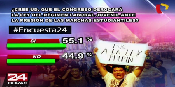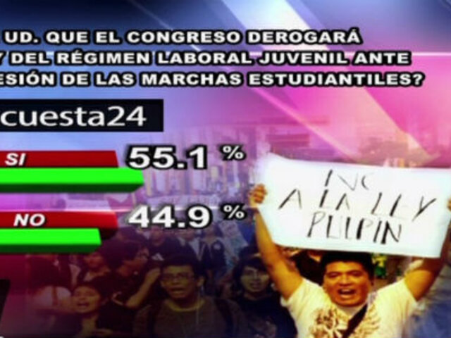 Este jueves en Encuesta 24 preguntamos: “¿Cree usted que el Congreso derogará la ley del Régimen Laboral Juvenil ante la presión de las marchas estudiantiles?”. Un 55.1% respondió que sí.