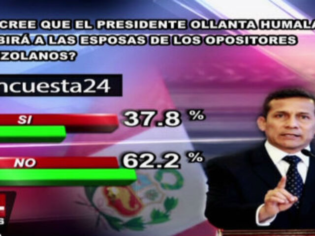 A la pregunta de este jueves en Encuesta 24: “¿Usted cree que el presidente Ollanta Humala recibirá a las esposas de los opositores venezolanos?rdquo;, un mayor 62.2% consideró que ‘No’. Un 37.8% votó que ‘Sí’.