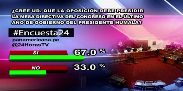 La pregunta de este martes en Encuesta 24: “¿Cree usted que la oposición debe presidir la Mesa Directiva del Congreso en el último año de Gobierno del presidente Humala?rdquo;. Un 67% afirmó que ‘Sí’. Un menor 33% votó ‘No’.